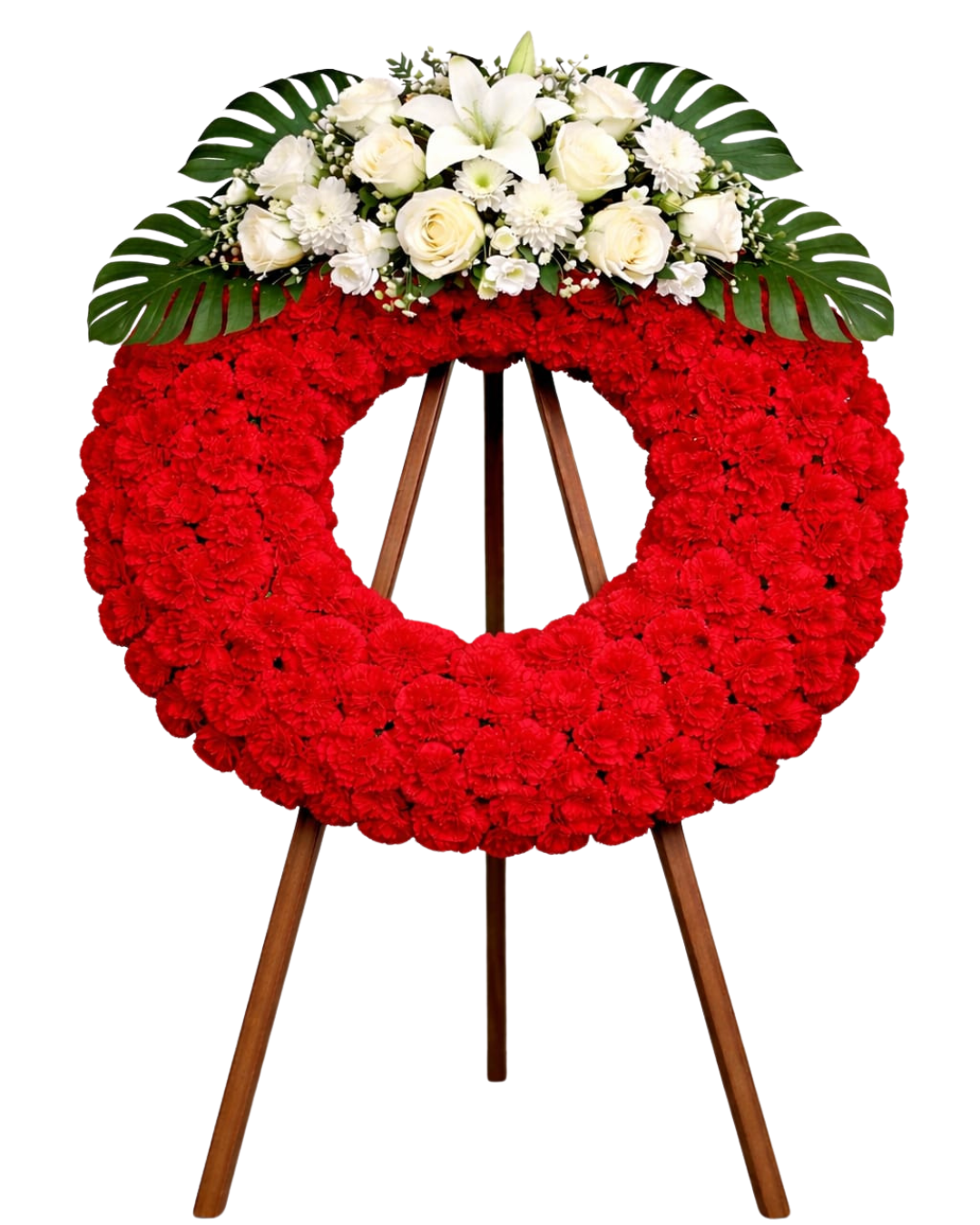 El rojo predominante simboliza el vínculo fuerte y el afecto duradero, mientras que la cabecera en tonos blancos aporta equilibrio, serenidad y solemnidad al conjunto. La combinación crea una corona impactante, elegante y muy respetuosa, ideal para despedidas formales y homenajes significativos.