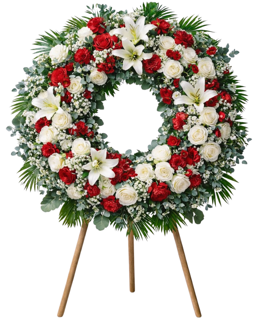 La corona funeraria roja y blanca clásica combina dos colores de gran simbolismo para expresar amor, respeto y recuerdo eterno.