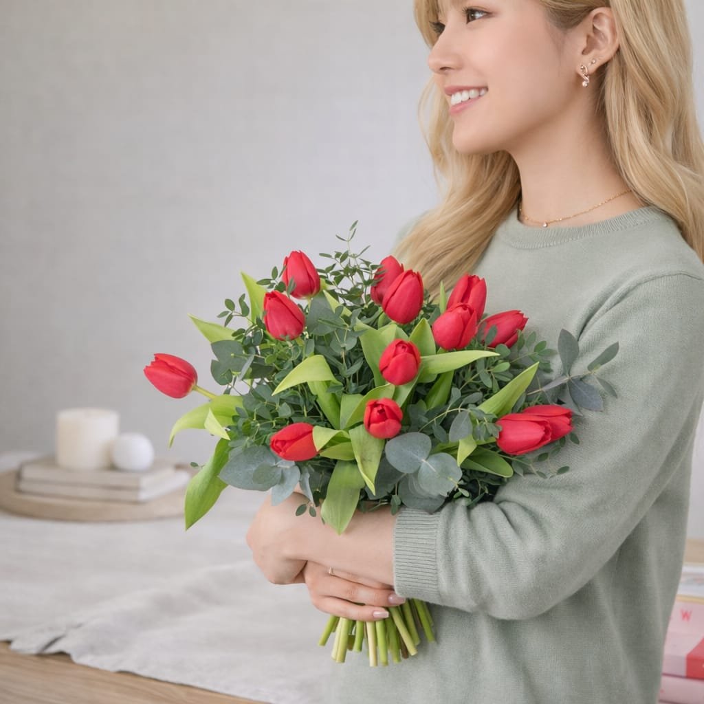 Hay gestos que no necesitan ruido para ser inolvidables. “Sinfonía Romántica” apuesta por la belleza del “menos es más”. La intensidad de los tulipanes rojos, símbolo del amor perfecto, resalta sobre el verde aromático del eucalipto, creando un contraste visual moderno y muy elegante. Es el regalo definitivo para quienes tienen un gusto exquisito y valoran la sofisticación. Perfecto para aniversarios o una declaración de amor con clase.