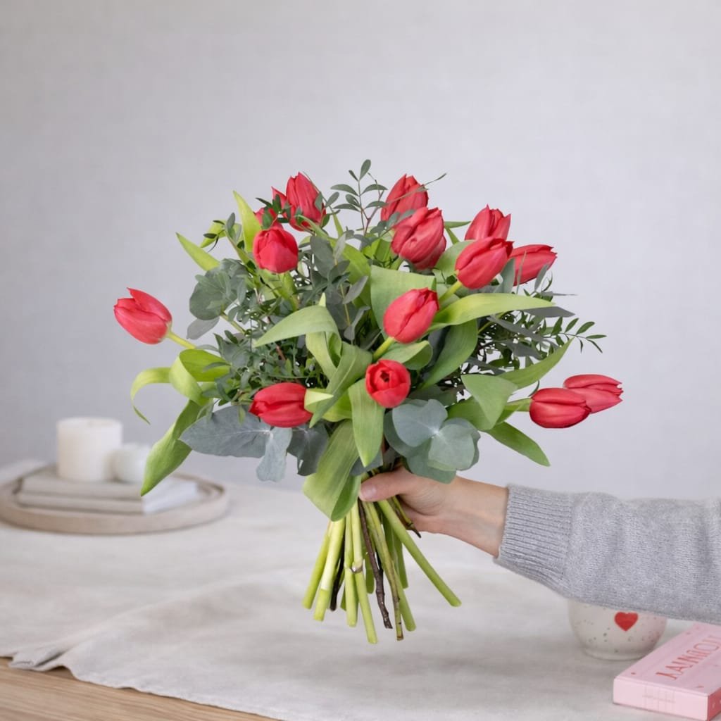 Elegancia minimalista con tulipanes rojos frescos y eucalipto. Un clásico sofisticado para expresar amor puro sin excesos.