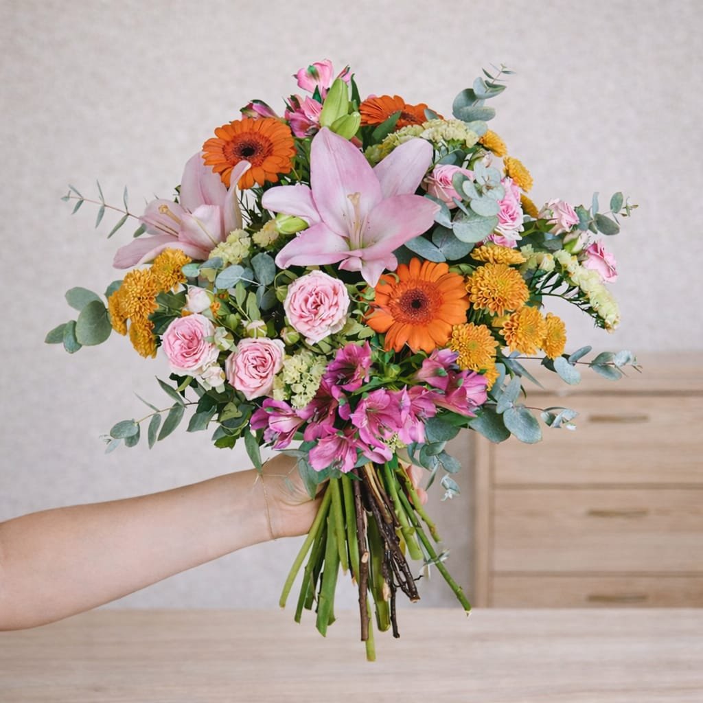 ¿Quieres verle sonreír nada más abrir la puerta? El ramo “Suspiro” es alegría condensada. Hemos combinado flores silvestres y clásicas en una paleta de rosas y naranjas que rompe con la monotonía. Es un diseño fresco, divertido y lleno de vida, ideal para celebrar cumpleaños, felicitar un logro o simplemente para levantar el ánimo a alguien especial.